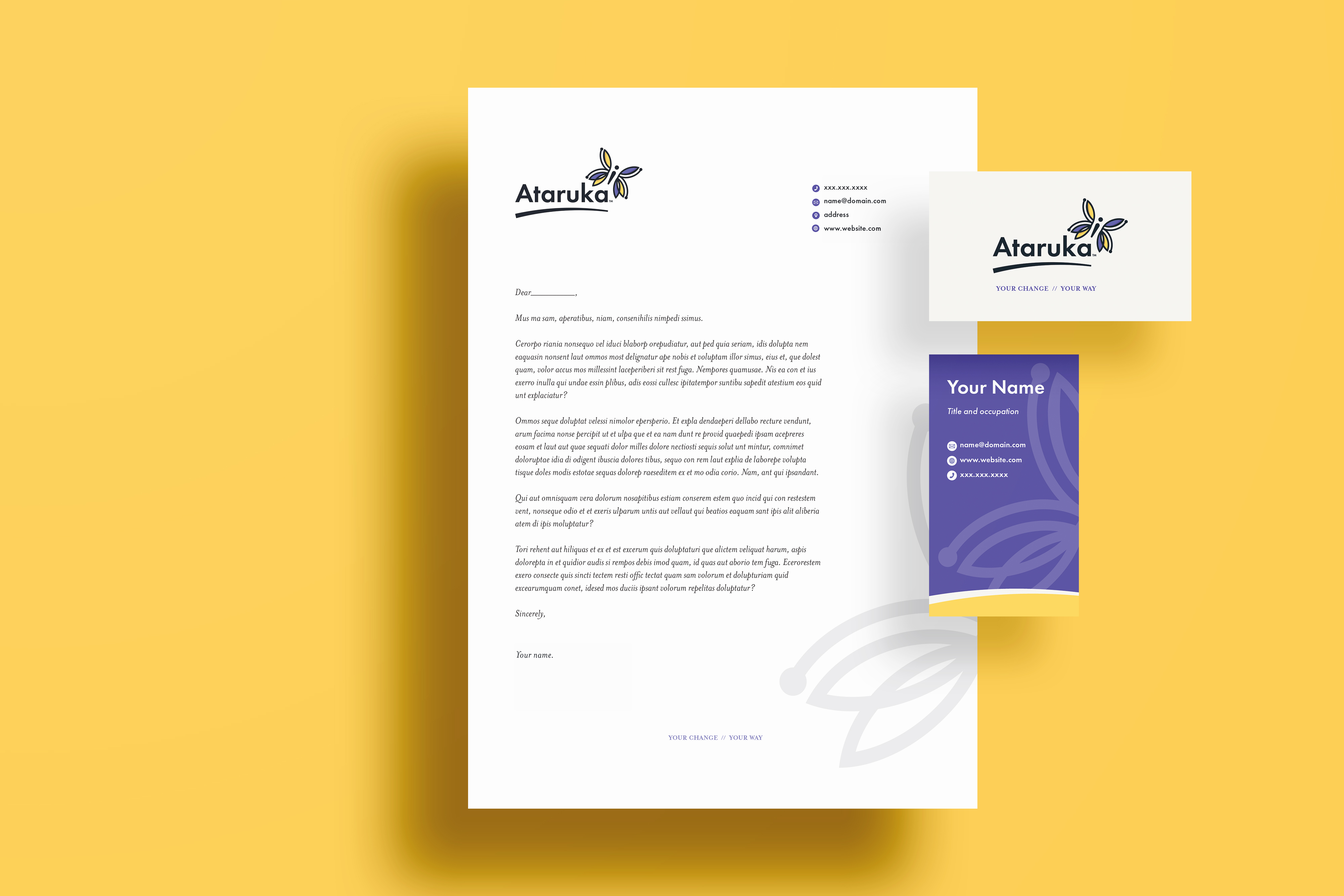 Stationary including a letterhead and business card designed for the brand.